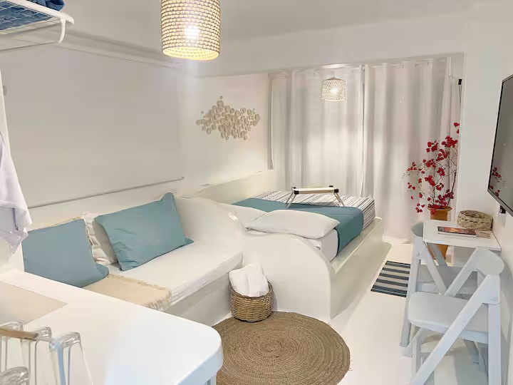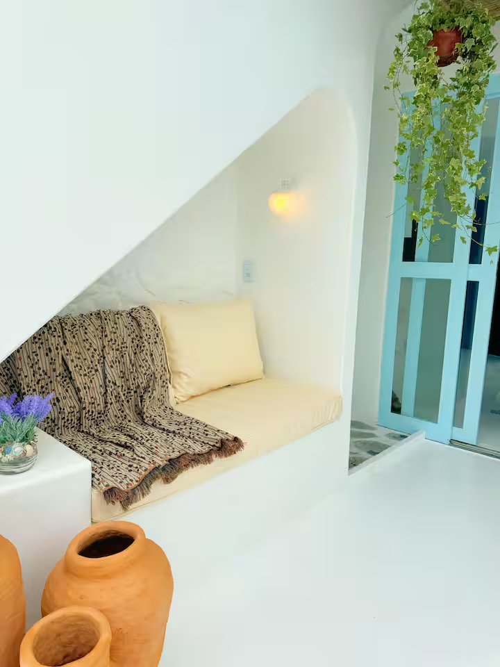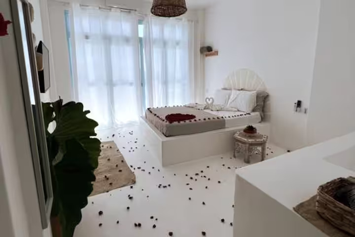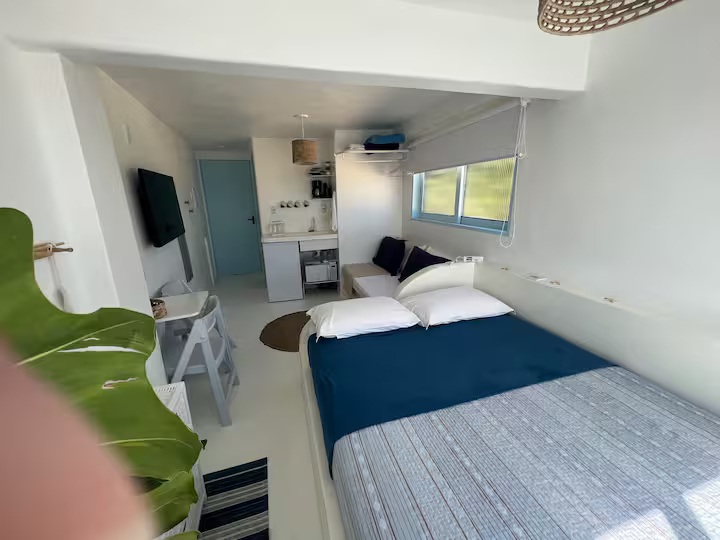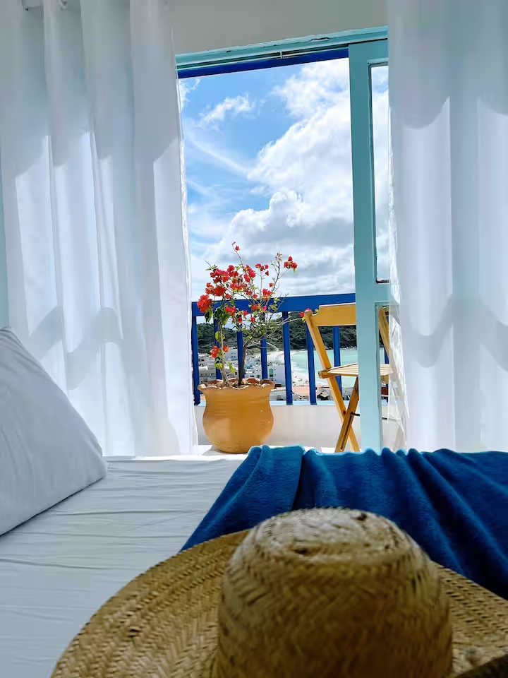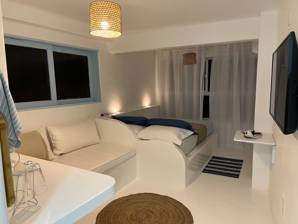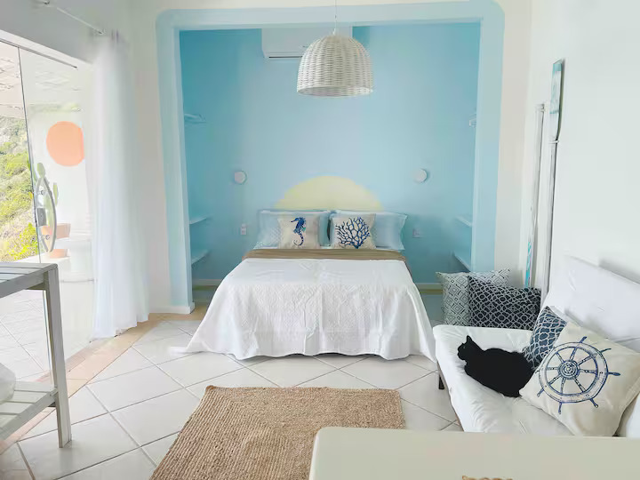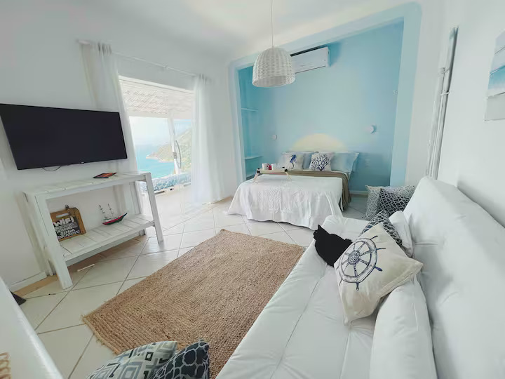 A Suíte Santorini é um refúgio aconchegante no alto do canto direito da Prainha, em Arraial do Cabo, com uma vista incrível para o mar azul-turquesa. Decorada em estilo grego, a acomodação é compacta e perfeita para casais, podendo receber até três pessoas. Dispõe de cama de casal confortável, sofá-cama pequeno para uma pessoa, ar-condicionado, Wi-Fi eficiente, TV smart 43” com streaming, além de mini cozinha equipada com frigobar, micro-ondas, cafeteira e sanduicheira. O banheiro possui chuveiro quente e roupas de cama e banho estão incluídas.