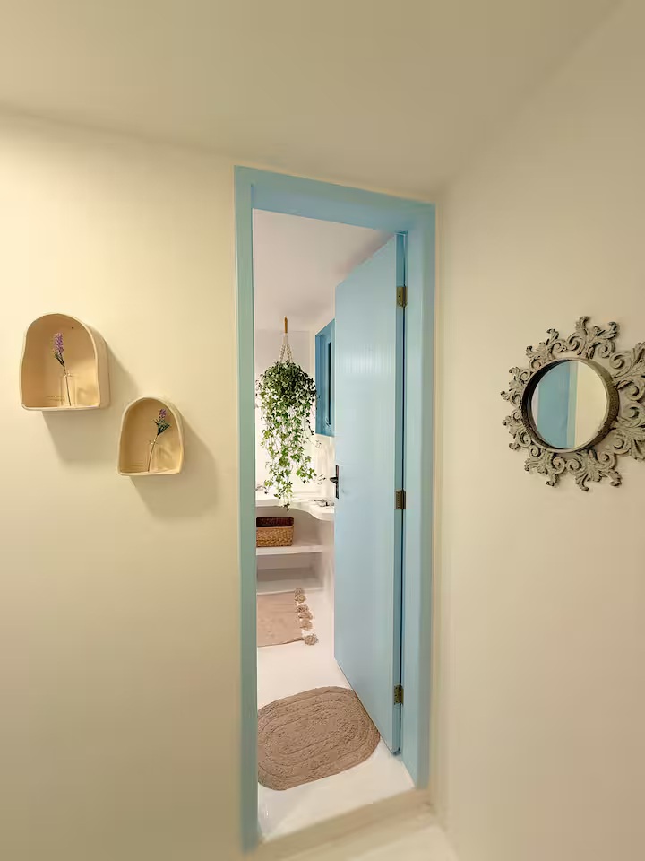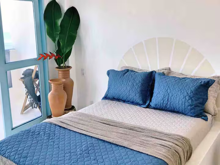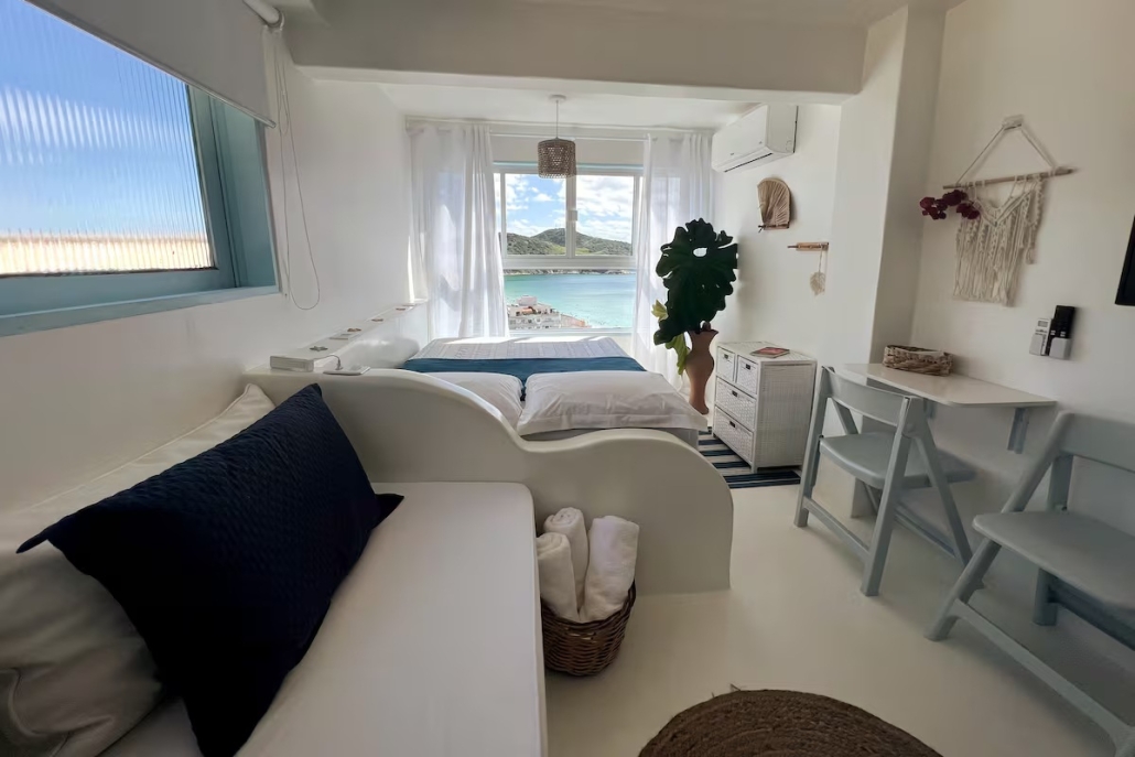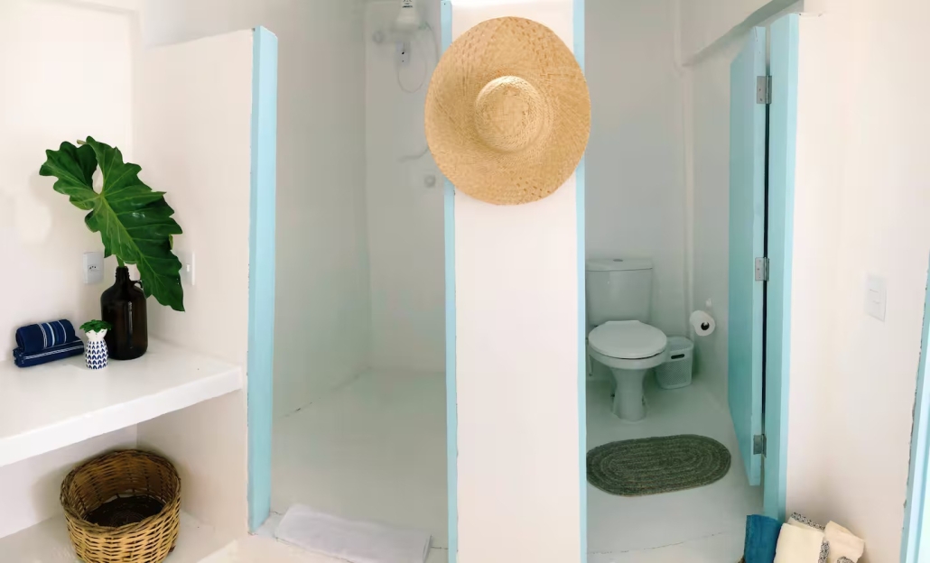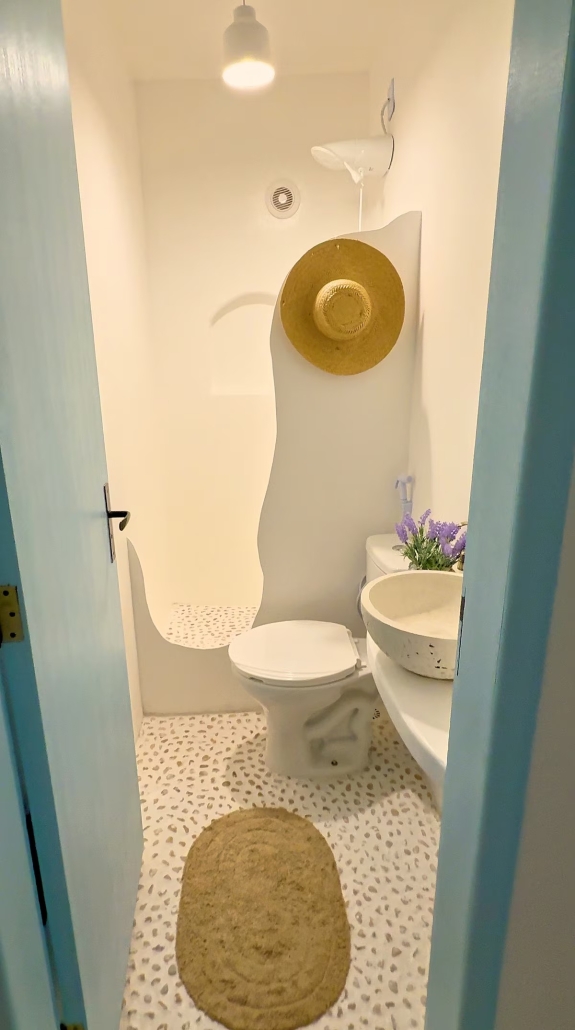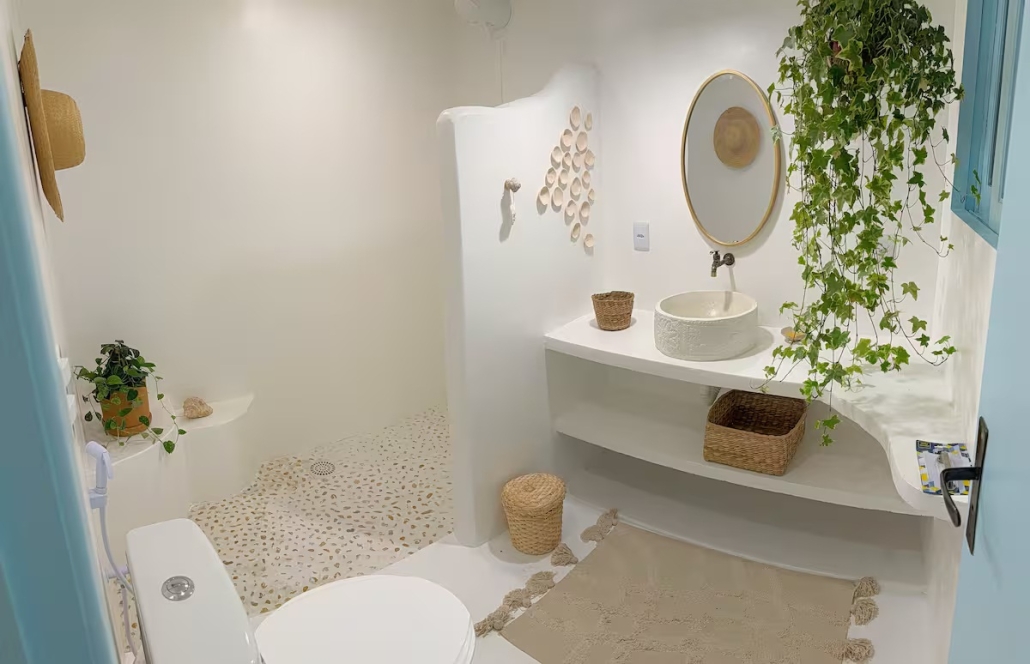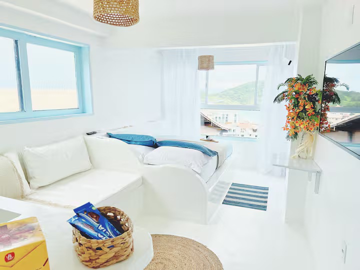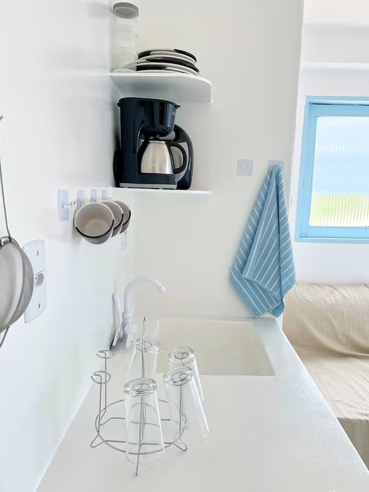 A Suíte Santorini é um refúgio aconchegante no alto do canto direito da Prainha, em Arraial do Cabo, com uma vista incrível para o mar azul-turquesa. Decorada em estilo grego, a acomodação é compacta e perfeita para casais, podendo receber até três pessoas. Dispõe de cama de casal confortável, sofá-cama pequeno para uma pessoa, ar-condicionado, Wi-Fi eficiente, TV smart 43” com streaming, além de mini cozinha equipada com frigobar, micro-ondas, cafeteira e sanduicheira. O banheiro possui chuveiro quente e roupas de cama e banho estão incluídas.