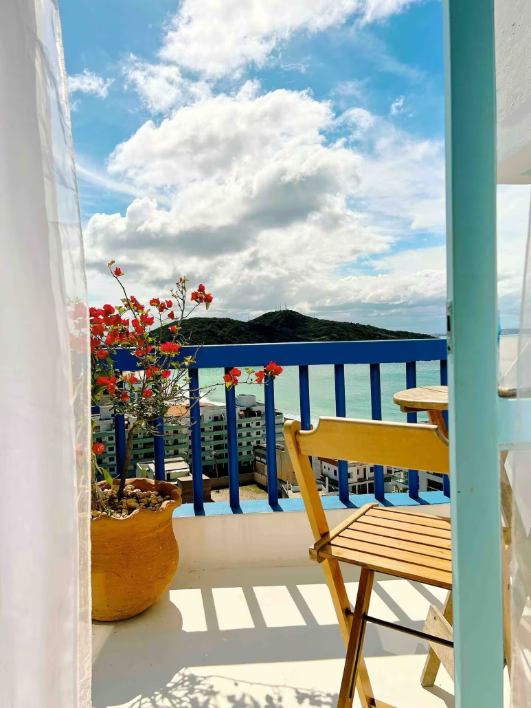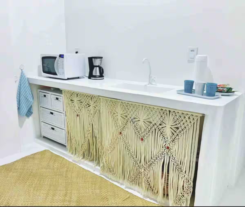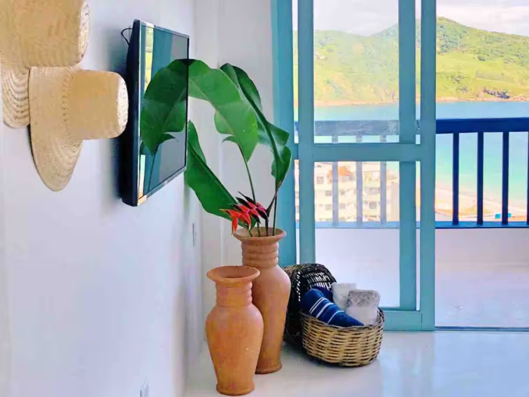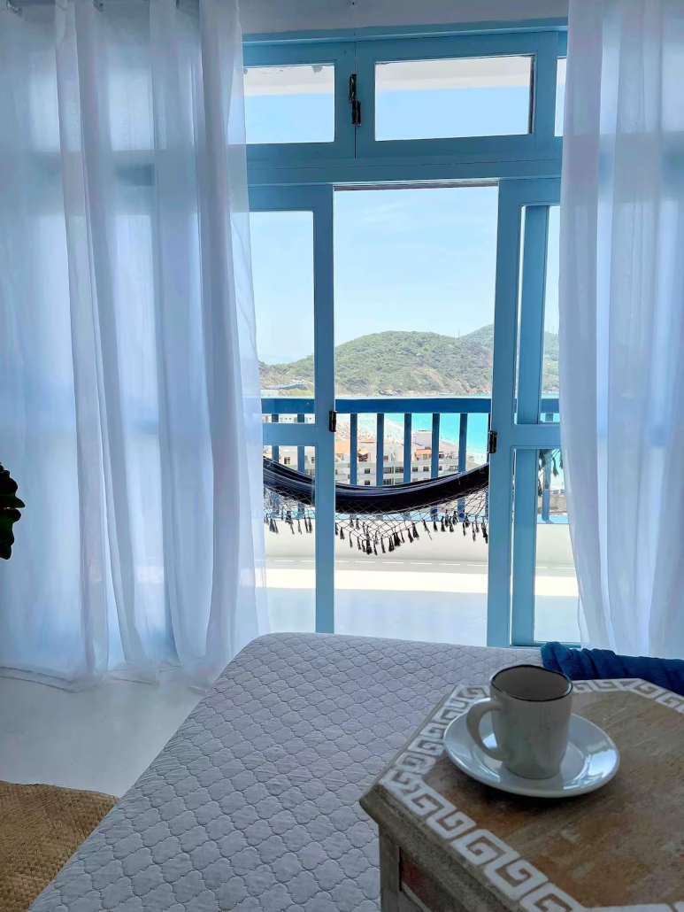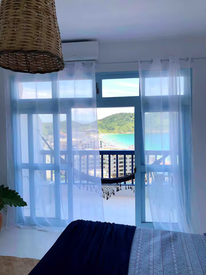 A acomodação possui duas varandas, rede para relaxar, sala com sofá-cama, TV smart de 43” com Netflix, Amazon Prime e GloboPlay, internet rápida e ar-condicionado.
